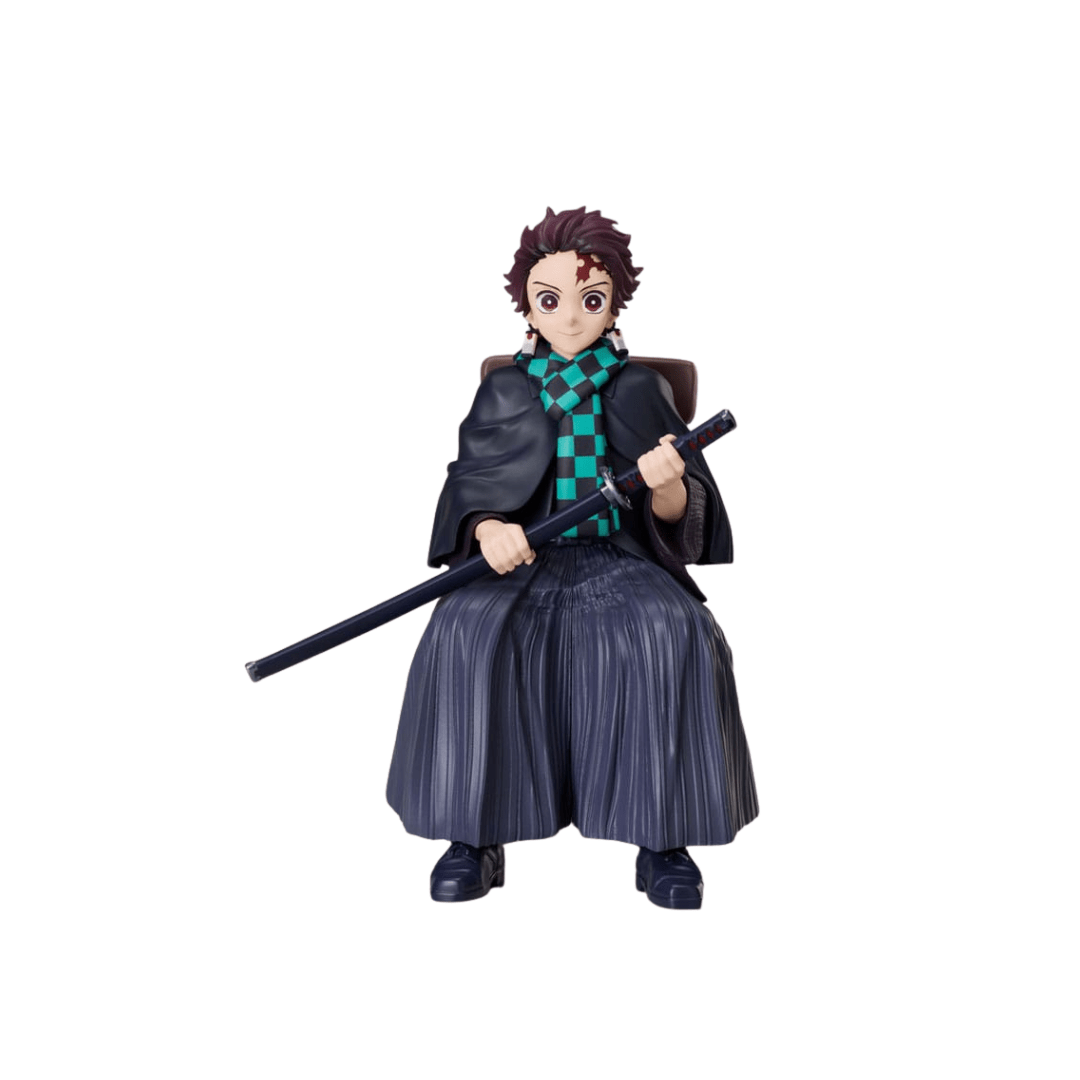 Tanjiro trägt seine klassische dunkelgrüne Dämonenjäger-Uniform unter seinem ikonischen, grün-schwarz karrierten Haori.