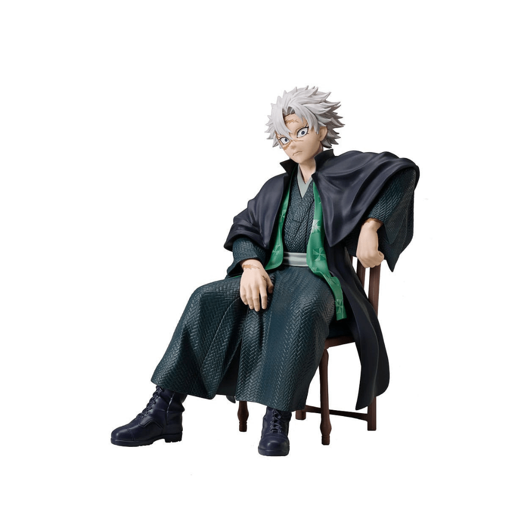 Die detailreiche Skulptur zeigt Sanemi in einer ungewohnt ruhigen, aber dennoch kraftvollen Sitzpose auf einem schlichten Holzstuhl.